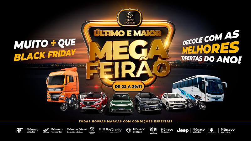 O Grupo Mônaco promove, até o dia 29 de novembro, a última e maior edição do Mega Feirão 2025. Com o slogan “Muito + que Black Friday”, o evento reúne condições especiais e vantagens únicas em veículos novos, seminovos, pós-venda, locação e consórcio.